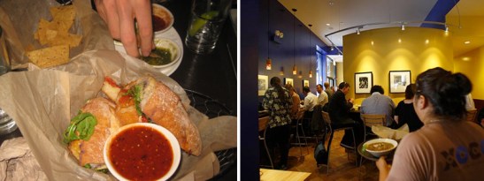 The majority of the menu and their claim to fame are the tortas – a Mexican sub sandwich. I ordered the Woodburning oven Chipotle Chicken Torta with Gunthorp chicken, chipotle-roasted tomato sauce, artisan Jack cheese, avocado, black beans, arugula and Bull Dog Corner orderd the Pepito Torta with Braised Tallgrass shortribs, caramelized onion, artisan Jack, black beans, and pickled jalapenos. We also got chips and guacamole to start with and churros to finish. They make their own frothy Mexican hot chocolate (ground from Mexican cacao beans right in their front window) and prepared-to-order caldos (meal-in-a-bowl soups) that we will try our next time around. Everything we did eat, however, was complete perfection. Tortas? Amazing. Hot-from-the-fryer churros? Delicious. Homemade Mexican Vanilla Ice Cream to dip your churros in? BEST THING EVER.